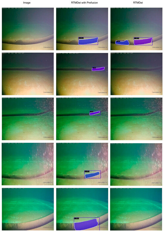 It can be seen that the baseline network in the dim underwater environment has misdetection errors, and its model segmentation accuracy is lower compared with the previous model detection results with the addition of the prefusion module. Meanwhile, when our target pipeline is close to or far away from the underwater ARV, underwater disturbances may stir up the silt under the water, causing the pipeline to be exposed to floating dust, which greatly increases the difficulty of model detection. As can be seen from the figure, in this situation, by adding the prefusion module, the model fully understands and learns the semantic information of the context in the feature map, which enables the model to maintain sufficient detection and segmentation accuracy, even in the dusty underwater environment. Secondly, when the ARV is far away from the oil pipeline, the pipeline in the image almost blends in with the background color in the dim environment, owing to the limited distance of the light, leading to difficulty in detecting the seabed-contacting segment of the oil pipeline. The original baseline model is no longer able to detect and segment in this environment. Correspondingly, after adding the feature prefusion module, the ability of the model to judge the position of the oil pipeline seabed-contacting segment is enhanced and its generalization ability is improved so that, even in a situation where the target oil pipeline almost merges with the background color, it still maintains good detection and segmentation performance, and the segmentation accuracy can still be guaranteed.