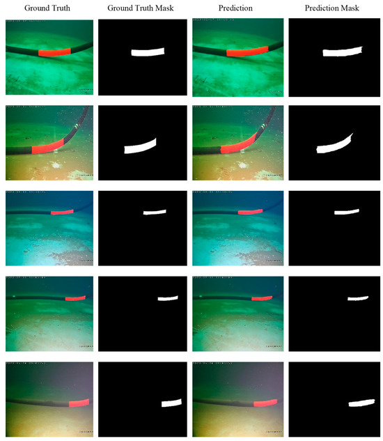 In Figure 15, underwater pipeline images under different lighting and distance conditions are shown from top to bottom. The real labeling map and its mask map, and the prediction map and its mask map are shown from left to right, respectively. We simply want to compare the boundary accuracy of the segmentation without considering the different Hausdorff distances between the label map and the prediction map caused by the color changes in the images. Therefore, we transform both the segmented label part and the segmented pipeline part in the prediction map into mask maps in binary form. Using the binary form of the labeled mask map and the predicted mask map, we calculate the Hausdorff distance of both to evaluate the segmentation accuracy of the picture.