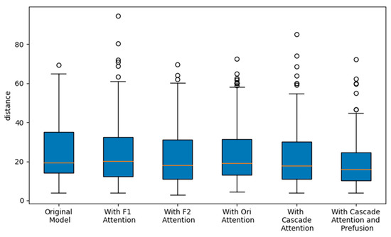 In our test dataset, we test different combinations of modules to calculate the Hausdorff distance and plot it as a line graph, as shown in Figure 16. The average Hausdorff distance is plotted in the figure. We see that the overall Hausdorff distance shows a decreasing trend with the addition of our modules, indicating that the accuracy of segmentation continues to improve, and that there is a significant portion of the dataset in which the degree of fluctuation in Hausdorff distance continues to decrease with the addition of our modules. This is a good indication of the effectiveness of our proposed modules.