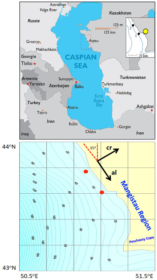 (Upper panel) Study region (red box) and positions of the mooring stations (inset). The yellow circle indicates the City of Aktau where the meteorological station was located. The blue contours in the inset are the 20 m and 100 m isobaths. (Lower panel) Bathymetry map. The depth contours are drawn with an increment of 10 m. Red bullets indicate the positions of mooring stations. The black arrows give the directions of the along-shore (al) and cross-shore (cr) axes used in this study.