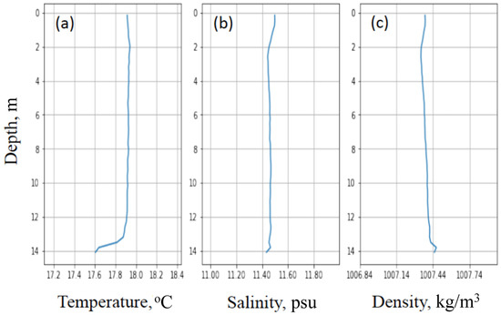 CTD-derived data of profiling at Station 1 on the day of deployment of the mooring stations (18 October 2022). (a) Temperature, °C; (b) Salinity, psu; (c) Density, kg m−3.