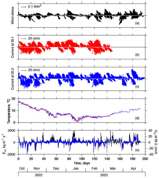 Summary of collected data: (a) Wind stress vectors; (b) Current velocity vectors at Station 1; (c) Current velocity vectors at Station 2; (d) Near-bottom water temperature at Station 1 (red) and Station 2 (blue); (e) Cross-shore component of calculated Ekman transport (black) and cross-shore velocity component at Station 2 (blue).
