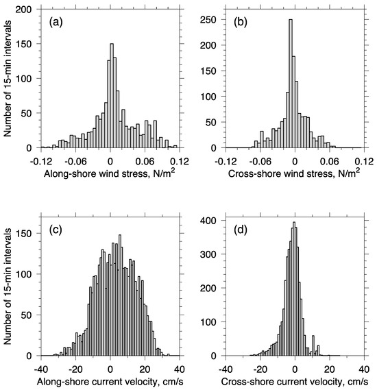 Histograms of the along-shore wind stress (a), cross-shore wind stress (b), along-shore current velocity (c), and cross-shore current velocity (d) for the entire period of observations at both stations. The bin width is 1 cm s−1 for velocity and 5 × 10−3 N m−2 for wind stress.