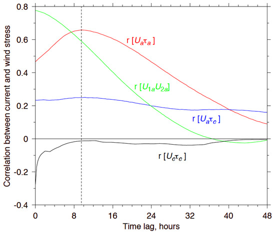 Some results of correlation analysis applied to the components of the velocity and the wind stress are depicted in Figure 5. To draw the figure, we calculated the Pearson correlation coefficients r between different series as functions of the temporal shift between them. All curves in Figure 5 correspond to the data collected at Station 2 (except the green one calculated based on both stations), where the series was longer. The respective curves for Station 1 are similar and not shown here.