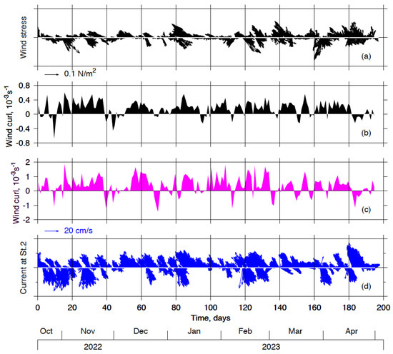For the purposes of this study, we refer to the along-shore and the cross-shore component of both current velocity (Ual, Ucr) and wind stress (τal, τcr), rather than the conventional zonal and meridional components. The procedure of such a conversion is described in [32], for example. In our case, the conversion was made based on the assumption that the coastline in the study region was oriented at an angle of 35° with respect to the meridian (direction SSE-NNW). Hereinafter, the positive sign of the along-shore component corresponds to the SSE direction and that of the cross-shore component to the onshore direction (Figure 1, lower panel).