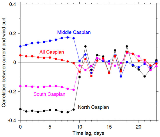 Lagged correlations between wind speed curl averaged over the entire Caspian Sea (red), Southern Caspian (magenta), Middle Caspian (blue), and Northern Caspian (black) on the one hand, and the along-shore current velocity at Station 2 on the other.