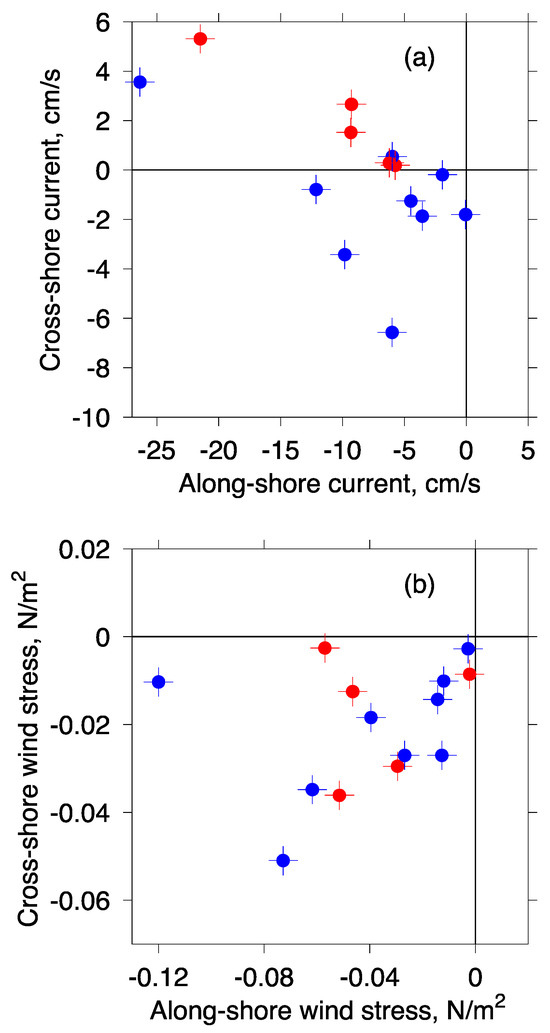 (a) Positive (red) and negative (blue) major temperature anomalies vs. the cross-shore current velocity and along-shore current velocity; (b) Positive (red) and negative (blue) major temperature anomalies vs. the cross-shore wind stress and along-shore wind stress.