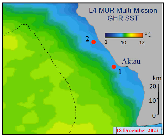 The abovementioned properties taken in consideration together might be indicative of the local, submesoscale near-bottom advection as the principal origin of temperature variability. Indeed, all major positive temperature anomalies took place when the cross-shore component of the current velocity was directed onshore spanning from 0.2 to 5.3 cm s−1 (Table 1). We note also that if we examine the entire temperature anomaly data set and not only the major anomalies, we find that the majority of events where the cross-shore velocity was directed on-shore were accompanied by positive temperature anomalies (7015 out of 11,690). Because we refer here to the near-bottom velocity, such events represented local upwelling. Despite the common notion that upwellings usually result in cold anomalies (which is indeed the case in the vast majority of cases), they can also have opposite thermal signatures in winter time, particularly in shallow environments prone to intense cooling from the surface. In such situations, waters from deeper layers maintaining higher temperature climb up the bottom slope and, while mixing convectively with colder surface water, may produce a significant warming effect. This phenomenon of «warm upwelling» has been reported for the Gulf of Finland [49], the Atlantic shelf of Spain [50], and the southern Baltic Sea [51]. In a synthesized multi-sensor satellite-derived sea surface temperature (SST) field taken on the day of the strongest recorder positive anomaly (18 December 2002), there are features that could be interpreted as an indirect supportive evidence of such a warm upwelling event, manifested as a stripe and several individual spots of relatively warm water near the shelf break surrounded from either side by colder ambient waters, see Figure 9.