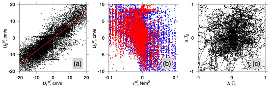 (a) Along-shore velocity at Station 1 vs. along-shore velocity at Station 2. The red line is the regression line; (b) Positive (red) and negative (blue) temperature anomaly occurrences depicted vs. respective values of along-shore wind stress and cross-shore current at Station 2 within the shown intervals; (c) Temperature anomalies at Station 1 vs. temperature anomalies at Station 2.