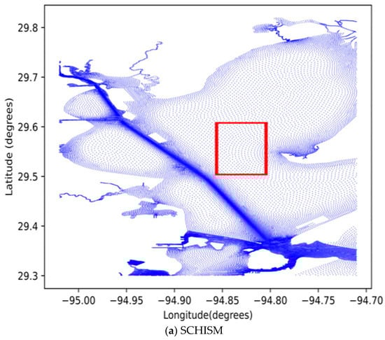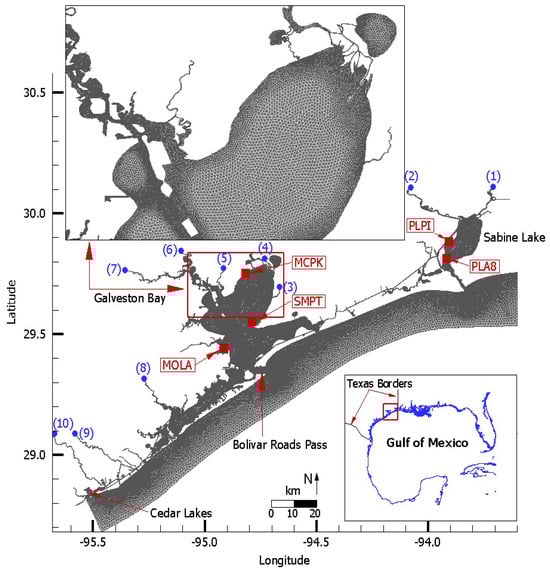 For the SCHISM simulation, we utilized an unstructured model grid comprising triangular and quadrilateral meshes, as outlined by [24], which also provides a comprehensive explanation of the model grid development process. The model grid extended from Cedar Lakes to Sabine Lake, encompassing approximately one-third of the Texas coast (Figure 1). The rectilinear grid was used at most ship channels, and the remaining zones were covered with triangular meshes. The final horizontal model grid consisted of 126,474 nodes and 210,510 elements with minimum and maximum grid sizes of approximately 10 m and 3000 m, respectively.