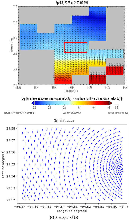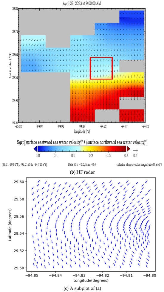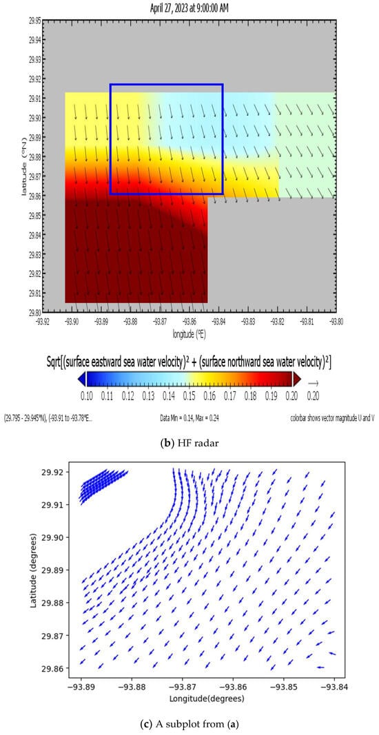 The color bar used in Figure 2b indicates the magnitude of the water velocity, and the formula shown on the bar combines both the eastward (U) and northward (V) components into a single speed value—the speed of the surface current. The cooler color (blue) in the bar indicates lower velocities, while the yellow to red colors indicate higher velocities, thus showing the variation in the current magnitude across the plotted area. Also, the reference value indicated at the end of the color bar refers to the scale of the vector arrows. In Figure 2b, the reference value is 0.5 (which means 0.5 m/s), and the arrow above it implies that the plotted vectors (current arrows) are scaled relative to 0.5. So, an arrow (current vectors) half the length of the reference arrow would indicate a current speed of 0.25 m/s. This helps readers to understand the magnitude of the currents by visually comparing the arrow sizes. The two triangles at the end of the color bar represent the outlier borders which help to ensure that extreme values (>0.5 or <0.0) are visually distinguished from the primary data range. Finally, the plotting boundaries (latitude (29.305° N–29.805° N), longitude (−95.015° E to −94.655° E)), defining the spatial extent of the data denoting the study area (in this case GB) have been added in the plot. The above explanation applies to all the radar plots (Figures 2b, 5b, 8b, and 11b) presented in this paper.