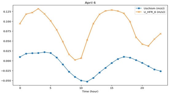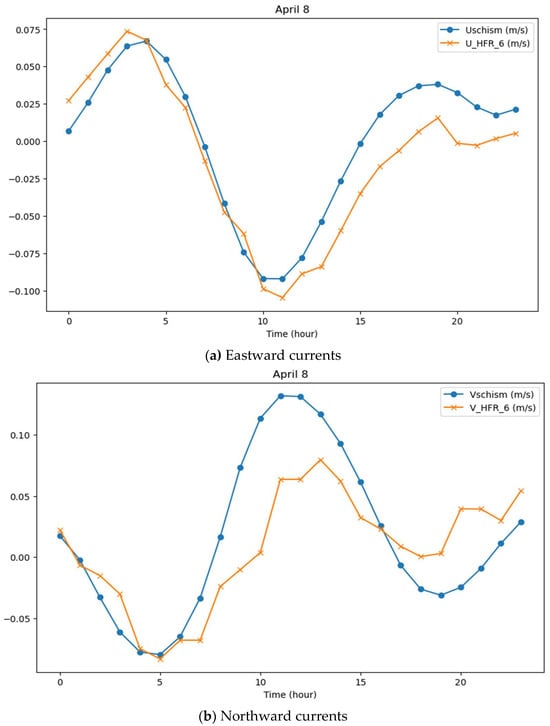 Comparison of (a) eastward currents from model (Uschism) and HF radar (U_HFR_6) 8 April 2023; (b) northward currents from model (Vschism) and HF radar (V_HFR_6) for the entire 24 h of 8 April 2023 at Galveston Bay.