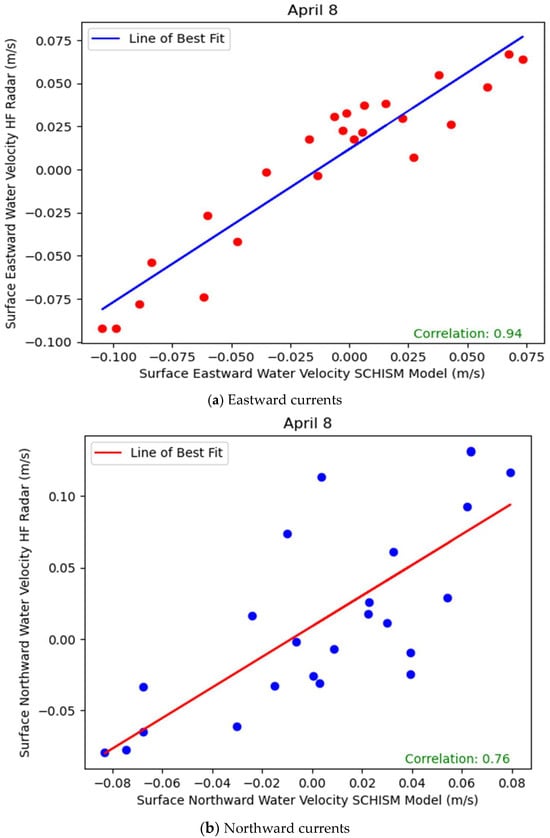Correlation between the simulated (SCHISM) and observed (HF radar) hourly averages of currents (total water velocity) in (a) eastward and (b) northward directions for the entire 24 h of 8 April 2023, in GB.