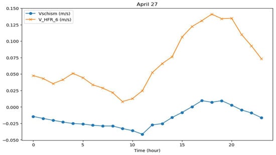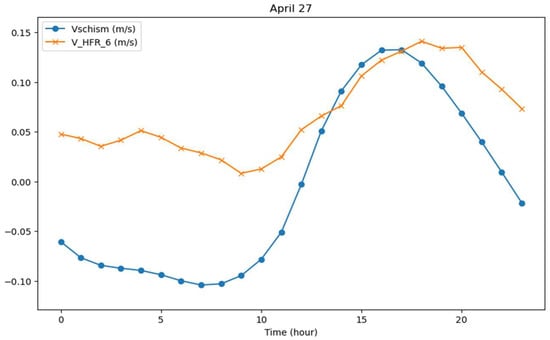 Comparison of northward currents from SCHISM (Vschism) and HF radar (V_HFR_6) over time at GB on 27 April 2023.