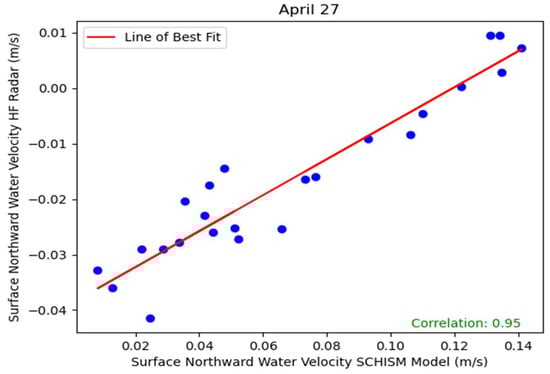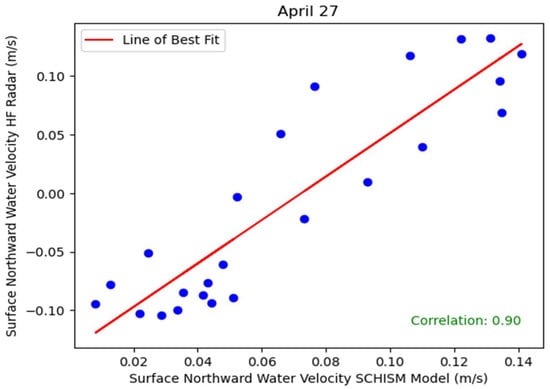 The strong significant correlation coefficient of 0.90 between the northward surface current magnitudes estimated by the model with the radar on 27 April (Figure 7) reinforces the earlier qualitative comparison (Figure 5), which showed dominant northward water movement in the bay. This suggests that days with high correlation in the northward direction indicate consistent northward flow, signifying the stable water movement pattern appreciably captured by the model and radar.