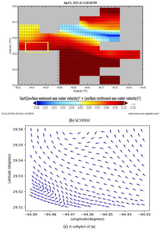 The qualitative analysis of the current vectors shown in Figure 8 above shows that the eastward currents dominated, particularly in the negative east direction (westward, south-westward, northwestward). Both methods capture these current directions at this time of the day further suggesting their capability in effectively detecting the predominant flow patterns within the bay. Again, the subplot (Figure 8c) is derived from just a portion of the bay (−94.99° E to −94.93° E and 29.51° N to 29.56° N), whereas the radar plot (Figure 8b) represents the entire bay. The part of the bay equivalent to the subplot (Figure 8c) is shown by the box with a yellow outline.