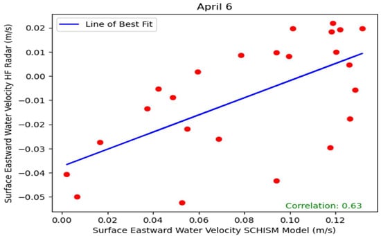 The observed minor disparity in the precise measurements of the currents by using the two methodologies in the eastward and northward directions could be attributed to a combination of factors including the wind dynamics within the bay, seasonal weather patterns prevalent in the month of April in the bay, and influence of the bay’s proximity to the Gulf of Mexico. Park [29] observed that the dominant winds in the bay are the southeasterly winds, and the bay–ocean interactions are usually influenced through the north-eastern direction. Salas-Monreal [1] inferred from his work that southerly winds dominate the bay from October to April, while northerly winds are more pronounced in the bay from May to September. Thus, the month of April is usually characterized by variable wind patterns in the bay, primarily driven by prevailing winds from the east or southeast. These findings support the outcomes summarized as shown in Figure 14 and Figure 16 (as well as shown in Figure 3, Figure 4, Figure 9, and Figure 10) for 8 April and 6 April, respectively. Moreover, the anticipated shift towards northerly winds dominating the bay by the end of April aligns with the result, which showed that the model estimated more northward currents precisely, reflected in a correlation coefficient of 0.8 or more, summarized in Figure 15 (as well as in Table 4).
