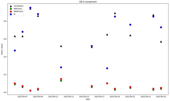 Plot of statistical evaluation of radar and model performance in predicting U-component current velocities at GB on days with significant correlation coefficients ( ≥ 0.5) only for the whole month of April 2023.