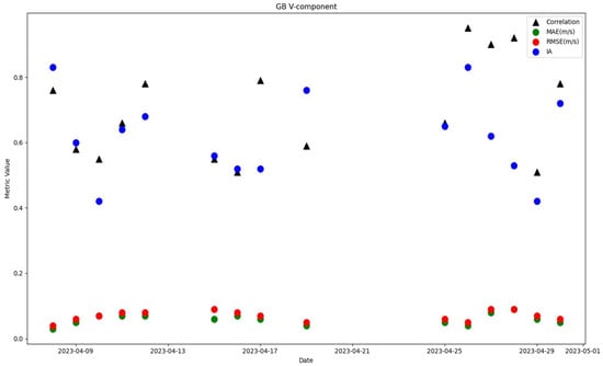 Plot of statistical evaluation of radar and model performance in predicting V-component current velocities at GB on days with significant correlation coefficients ( ≥ 0.5) only, whole month of April 2023.