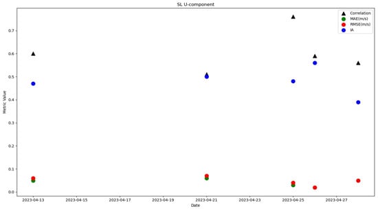In terms of the U-component on 8 April shown in Section 3.1.2 above, both the model and radar exhibited a strong correlation (corr.) of 0.94, indicating a high level of agreement in predicting eastward water velocities. The RMSE, MAE, and IA values further support the efficacy of the methods, with small error values in these metrics suggesting accurate predictions (Figure 14). On the other hand, 6 April exhibited a lower correlation (0.63) in the U-component, indicating a relatively weaker agreement between the model and radar predictions (in Figure 10 and Figure 14). The associated error metrics for this date were higher, implying some discrepancy in predicting the eastward water velocities.