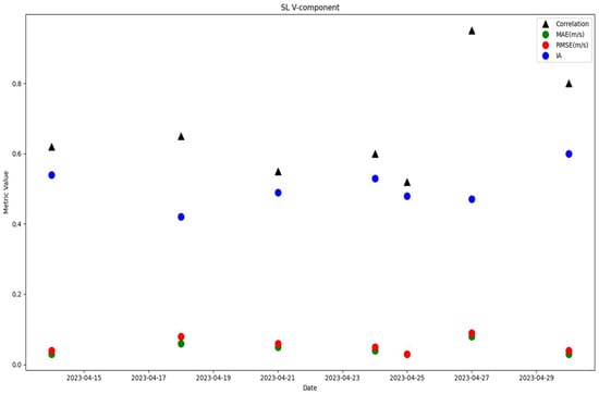 Plot of statistical evaluation of radar and model performance in predicting V-component current velocities at SL on days with significant correlation coefficients ( ≥ 0.5) only, whole month of April 2023.