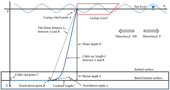 In this research, we adopt the OrcaFlex v11.0 to establish a ship-cable-seabed coupled numerical model for conducting analyses to obtain the bending radius and tension of submarine power cables during cable laying. The Orcaflex v11.0 numerical model mainly includes four parts, namely, the vessel model, the cable model, the seabed model, and the environmental loading model. The parameters of the above four models were obtained from Wang [22]. In this study, we adopt the S-lay method, which is one of the popular submarine cable installation methods characterized by an “S” curve during laying to the seabed. Figure 1 shows a schematic diagram of submarine power cable laying, which is positioned in a catenary line from the laying wheel point A in the laying vessel to the touch-down point B in the seabed by application of a certain tension in an on-board cable break device.