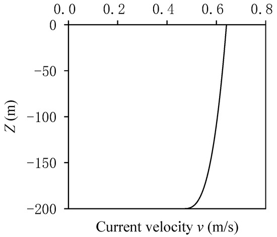 In the OrcaFlex v11.0, the “Environment” module is used to simulate waves and currents. The environmental parameters are obtained from Wang [22]. The current load refers to the effect of the relatively stable large-scale flow of seawater, which directly exerts a force on the movement of the vessel and the submarine power cable. The current load is mainly measured by the flow velocity, which generally varies with changes in the water depth. In the numerical model, the water depth is 200 m. The surface, middle, and bottom velocities of the current load are 0.641, 0.604, and 0.463 m/s, respectively, and the distribution of the current velocity follows a power-law distribution, as shown in Figure 2. The wave load is the main load acting on the vessel and the submarine power cable during cable laying. In the numerical model, the wave height is 2 m, the wave period is 10 s and the wave direction is 180°. During the laying of submarine power cables, wave and current loads are dynamically superimposed. The current load along the laying direction will cause the cable to experience maximum tension and minimum bending radius. Therefore, the direction of the wave load is set to be consistent with the direction of the current load in the numerical model.
