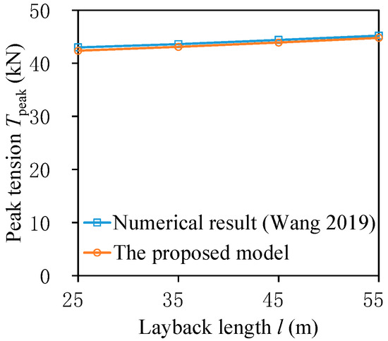 Peak tension analyses of submarine power cables under various layback distances, which refer to the horizontal distances between the top position of the submarine power cable and the touch-down point of the seabed, are conducted and compared with the numerical results obtained by Wang [22]. Comparison results in Figure 3 show that peak tension values of submarine power cables obtained by both numerical simulations are almost the same, with an average discrepancy of 1.18%, indicating that the numerical model established in this research is reliable in static analyses.