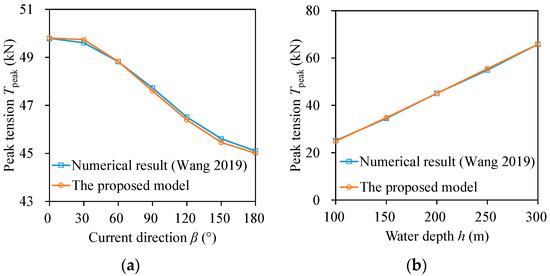 Peak tension of submarine power cables under dynamic analyses. (a) various current directions (b) various water depths, compared with Wang’s result [22].