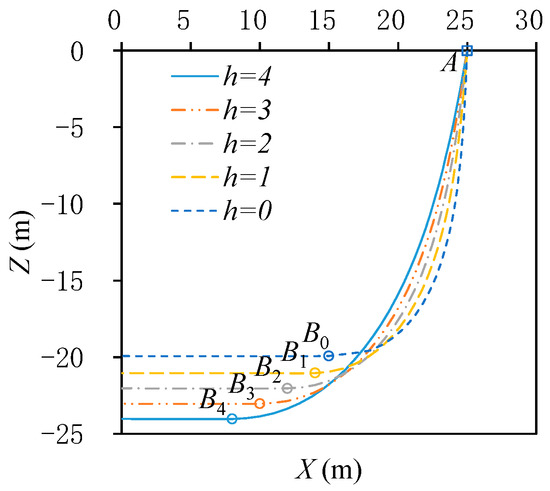 The configuration curves of submarine power cables under different burial depths are shown in Figure 6. Point A is the laying wheel point on the laying vessel, and B0 to B4 are the touch-down points of submarine power cables at different burial depths. When the burial depth h increases from 0 to 4 m, point B gradually moves away from point A, resulting in an increase in the cable arc length L between points A and B from 25 m to 32 m. That means submarine power cable installers need to adjust the cable length according to different burial depths during cable laying to prevent the cable from being too short and causing a sharp increase in cable tension.