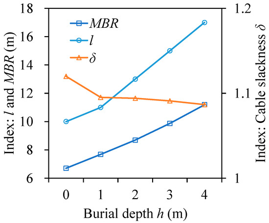 - The burial depths h significantly affect parameters of the cable configuration (the layback l, the cable slackness δ, and the minimum bending radius, MBR). The values of layback l and minimum bend radius (MBR) increase from 10 to 17 m and from 6.7 to 11.2 m, respectively, with the increase in h from 0 to 4 m; however, the values of δ decrease with the increase in burial depths when h < 1.0 m and then tend to be stable with the further increase in burial depths.