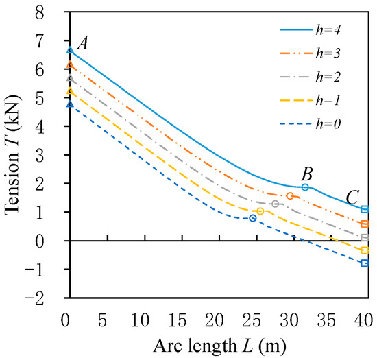 The distribution of cable tension T along the arc length at different burial depths h is shown in Figure 8. The tension of the submarine power cable reaches its maximum at the laying wheel point A and gradually decreases along the arc length direction. A clear inflection point appears at the touch-down point B. After touching the seabed, the tension continues to decrease and reaches its minimum value at the cable endpoint C.