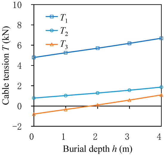 Changes in tension at points A, B, and C under different burial depths h are shown in Figure 9. The tension T1 at point A is the peak tension of the entire submarine power cable, which is the key control factor during cable laying. It is found that when the burial depth h increases from 0 to 4.0 m, the tension T1 increases from 4.8 to 6.7 kN, without exceeding the tension threshold value of 94.2 kN, which means the cable is still safe. The submarine power cable usually maintains a certain tension at point B. When the burial depth h is 0, 1, 2, 3, and 4 m, the tension T2 at B is 0.8, 1.0, 1.3, 1.6, and 1.9 kN, respectively. In addition, the burial depth changes the tension state at point C. When the burial depth h is 0 m, the tension T3 at point C is −0.8 kN, which means the submarine power cable is in a compressed state. When the burial depth h is 4.0 m, the tension T3 increases to 1.1 kN, and the submarine power cable turns into a tensile state.