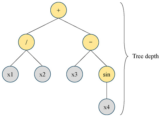 GP can generate an explicit function that builds the relationships between the input and output parameters of a model based on a tree structure consisting of terminals and functions [27]. The layout of GP is shown in Figure 10. GP generates an initial generation based on the preset set of functions and terminals, and continuously generates the next generation through genetic operations.