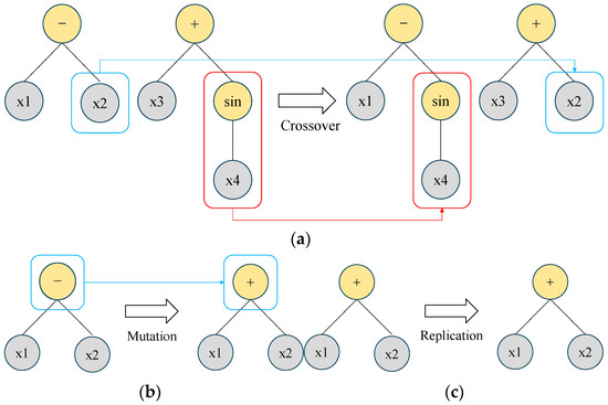 The tree crossover, mutation, and replication are the most widely used operations in GP [28]. Crossover nodes are randomly chosen and swapped to generate new individuals. Figure 12a shows that the crossover operation transforms individuals x1 − x2 and x3 + sinx4 into individuals x1 − sinx4 and x3 + x2. The mutation operator chooses a node and generates a new function to replace the original one to generate new individuals. Figure 12b shows the mutation operation that transforms individual x1 − x2 into individual x1 + x2. The replication operator generates new individuals to copy the original one as shown in Figure 12c.