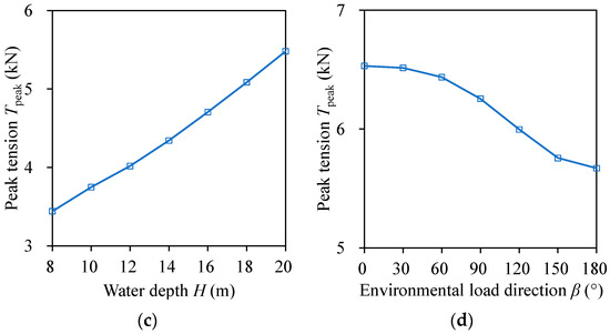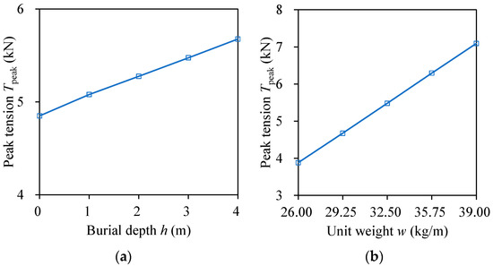 Sensitivity analyses were carried out to investigate the effects of the burial depth h, the unit weight of submarine power cables w, the water depth H, and the environmental load direction β on the peak tension of submarine power cables Tpeak. The parameter range involved in sensitivity analyses is shown in Table 4.