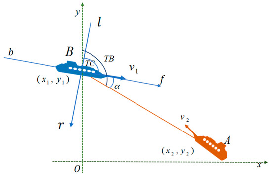 - The four psychological forces (, , , ) are decomposed according to the relative azimuthal into a coordinate system built with the course of the stand-on ship as the coordinate axis: