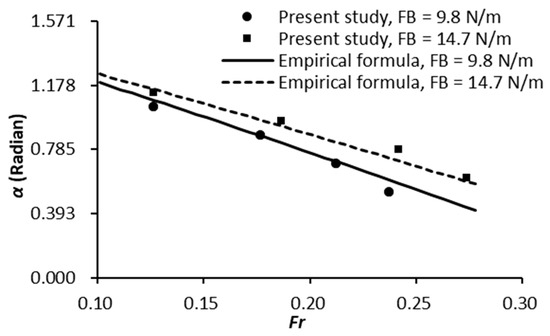 - The sloping angle of the floating plate descends almost linearly with the increase in the Froude number within the tested range of parameters. The prediction equation of a similar structure coincides well with the test results.