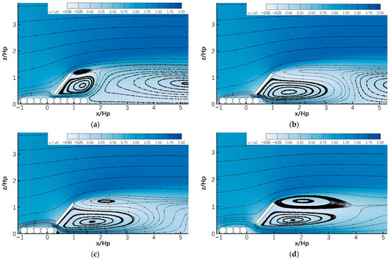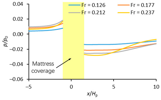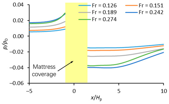 - The distribution pattern of bed pressure. When the mattress on the leeside of the floating plate was shortened, the pressure drop adjacent to the downstream edge of the mattress became more remarkable. The amplitude of bed pressure fluctuation also increased with the decrease in the downstream mattress length. This phenomenon can be associated with the variation of local flow pattern as the downstream mattress was shortened. A detailed discussion can be referred to in Section 5.2.