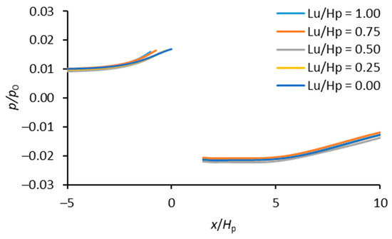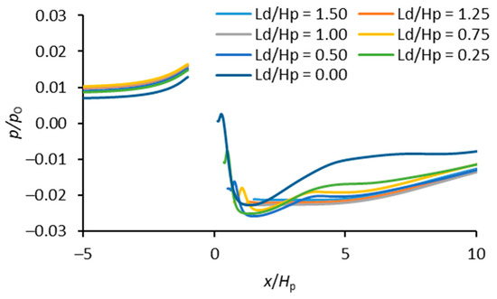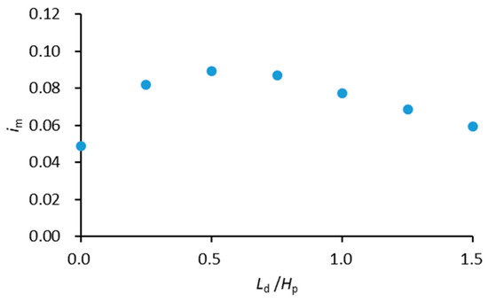 - The bed pressure on the downstream edge of the mattress. The bed pressure on the downstream edge of the mattress almost remained constant when Ld/Hp ≥ 1.0. With a further decrease in the downstream mattress length, the bed pressure on the downstream edge of the mattress gradually increased, but the increase was not remarkable for Ld/Hp ≥ 0.5. When Ld/Hp < 0.5, the rise of bed pressure on the downstream edge of the mattress became significant. This variation pattern can influence the effect of the downstream mattress length on the average seepage hydraulic gradient.