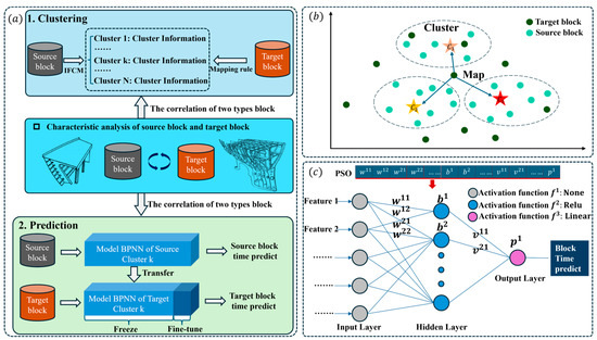 Training: A significant body of research suggests that neural network models optimized using particle swarm optimization algorithms (PSO-BPNN) outperform basic neural network models [15,40,41]. Moreover, the prediction accuracy of BPNNs correlates closely with the available sample size [37]. Therefore, this paper proposes the neural network models optimized using particle swarm optimization algorithms and the transfer learning (TR-PSO-BPNN) model involving three actions: transfer, freeze, and fine-tune. Initially, the PSO-BPNN models are initially trained on the clustered source domain blocks. Subsequently, the trained parameters of the model are transferred to the TR-PSO-BPNN models of the target domain blocks. Leveraging the similarities and differences between source and target domain blocks, actions involving freezing and fine-tuning neural network model parameters are adopted to train the TR-PSO-BPNN model on the clustered target domain block data. The outcome of this stage is the development of the TR-PSO-BPNN model capable of predicting the manufacturing time of target domain blocks.