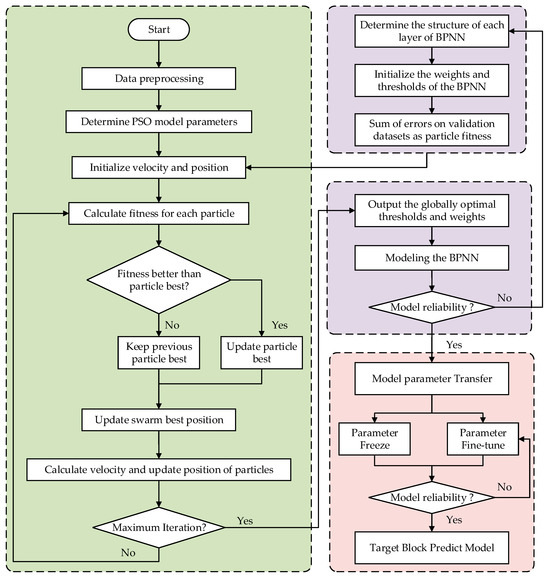 This paper establishes the TR-PSO-BPNN prediction model for target domain blocks by employing actions such as transfer, freeze, and fine-tuning from the PSO-BPNN model of the source domain. Initially, the PSO-BPNN model of the source domain is transferred to the target domain. Subsequently, considering the primary distinguishing features between the source and target domain blocks, the weights from the input layer to the hidden layer associated with non-primary distinguishing features are frozen to prevent further updates. The remaining parameters in the model are fine-tuned during training on the target domain block data. These actions aim to retain the beneficial impact of similar features between the source and target domain blocks on time prediction while mitigating interference caused by differing features affecting time prediction. The prediction flow chart of the TL-PSO-BPNN model is illustrated in Figure 2.