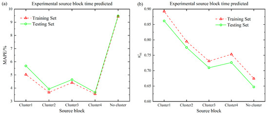 This paper aims to validate the effectiveness of the input features proposed for predicting ship block manufacturing time using the PSO-BPNN model. Furthermore, source domain blocks with and without clustering were compared to demonstrate the advantage of the clustering strategy. A proportion of 70% of the 1000 source domain blocks were allocated for training, and the remaining were utilized for testing. To mitigate the randomness in training, 100 random experiments were conducted. Due to varying sizes in each sample set, the corrected coefficient of determination ( was used to assess , as shown in Equation (18), where represents the sample size and represents the number of input features [48]. The average MAPE values of the source domain block time prediction model are shown in Figure 3a, and the values are shown in Figure 3b. The first four items on the x-axis in the figures represent the four clusters set in Figure 3, while the fifth item represents the source domain block set without clustering. It is evident that all the sample sets exhibit superior accuracy in terms of MAPE and values. Although the “No cluster” sample set shows relatively lower indicator values compared to other clusters, the MAPE values of the sample set reach 9.4% and 9.5% for the training and testing sets, respectively, with corresponding values of 0.673 and 0.646. The other four sample sets demonstrate better validation results. Thus, the results fully demonstrate that the selection of the five features for predicting ship block manufacturing time is correct and further validates the effectiveness of the clustering strategy employed in this paper.