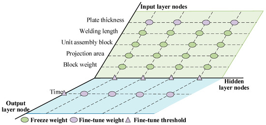 Considering the similarities and differences between the source domain and target domain blocks, the weights from the input layer to the hidden layer for features including block weight, number of unit assembly blocks, projected area, and weld length are frozen. Simultaneously, other weights and bias parameters are fine-tuned during the training process. Specific information about parameter freezing and fine-tuning in the TR-PSO-BPNN model is shown in Figure 4.