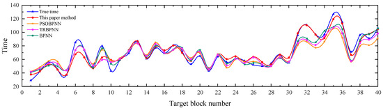 To further validate the superiority of the proposed method, this paper conducted comparative experiments using four methods under identical conditions. The four methods include the proposed method TR-PSO-BPNN, the PSO-BPNN method based on the ideas presented in [41], the TR-BPNN method based on the ideas presented in [37], and the basic BPNN method. It is important to note that the PSO-BPNN and TR-BPNN methods are reconstructed according to the methodologies from the respective literature, but the actual business data used in this study differ from the original datasets in the cited works. As a result, while the core modeling ideas are preserved, the methods have been applied and adapted to the specific characteristics of the shipbuilding domain in this study. After repetitively running each method 100 times, the predicted results were compared against the actual ship block manufacturing time. The resulting prediction curves are shown in Figure 6. Overall, the models developed using the three methods yielded satisfactory results, visually demonstrating the scientific nature of selecting the input features for predicting the manufacturing time of target domain blocks.