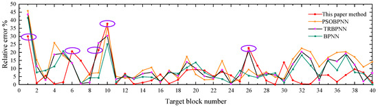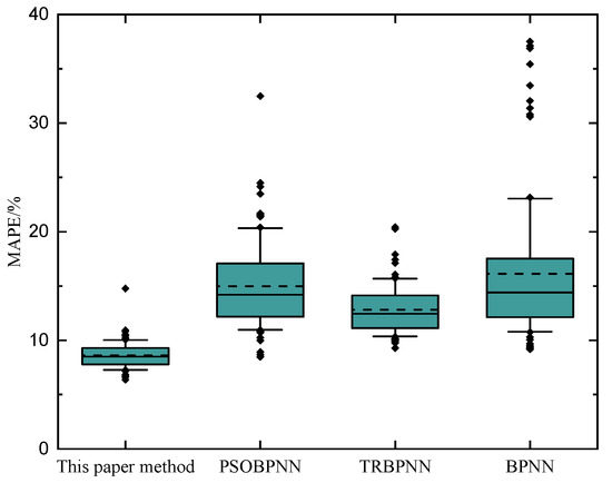 The method proposed in this paper demonstrated greater effectiveness compared to the other methods. The errors predicted by the comparison methods for the 40 sample points in the testing set are shown in Figure 7. In the figure, relative error values exceeding 20% are marked using circle points. It can be observed that the proposed method achieved superior prediction results except for sample points 1, 6, 9, 10, and 26. At sample points 1, 6, and 10, the errors were significant; nonetheless, the error values for the other models were also notable. This discrepancy may be attributed to the specific nature of the ship block constructions themselves. Two models outperformed the proposed method at sample points 9 and 26, indicating that there is still room for improvement in the proposed approach. Furthermore, a boxplot of the MAPE for the 100 experiments is shown in Figure 8. It is evident that the proposed method exhibited superior mean and median values and had more optimal, similar points, indicating better prediction accuracy and stability.
