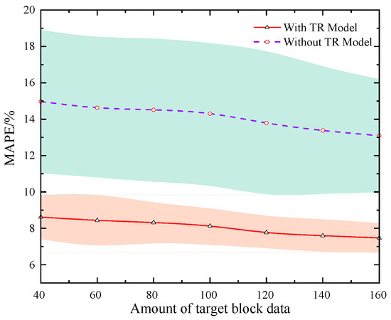 The prediction of target domain block time using 40 samples in this paper has already met the requirements for practical shipyard applications. To further demonstrate the superiority of the proposed method, different sample sizes were used to validate the model’s prediction. Out of the 200 target domain block samples, 160 were randomly selected to establish seven training sets containing 40, 60, 80, 100, 120, 140, and 160 samples, with the remaining 40 samples used as the test set. The effect of sample size on the MAPE of TR and non-TR models is shown in Figure 9. The lines represent the average MAPE values from 100 experimental runs, while the colored regions indicate the MAPE ranges. It is observed that the predictive performance of the model with-TR is significantly better than that without-TR. As the sample size increases, the average MAPE of both models decreases. Additionally, the fluctuation in the TR model is much smaller than in the without-TR model, indicating that the method proposed in this paper can effectively reduce the dispersion of the prediction results.