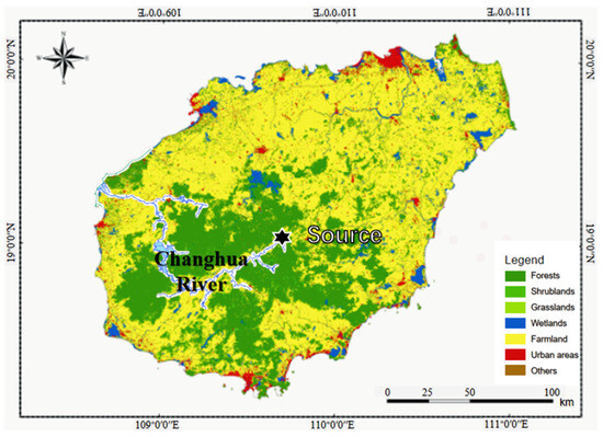 Land use patterns in Hainan province with a focus on the Changhua River Basin, the black star refers to the source of the Changhua River (Origin: International Research Center of Big Data for Sustainable Development Goals. DOI: 10.12237/casearth.63eb24d7819aec795e09af68. [36]).