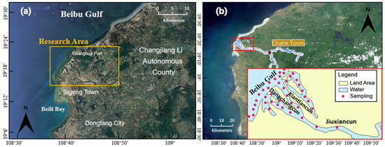 The study area is situated in the western part of Hainan Island, mainly encompassing the lower reaches of the Changhua River and its estuary (Figure 2). The approximate coordinates range from 108°36′ E to 108°50′ E and 19°15′ N to 19°22′ N. The study area covers a large part of the region from Chahe Town to the estuary of the Changhua River, including Xiantiancun, Dangchangcun and Jiuxiancun, among others. A total of 40 offshore sampling points were investigated and collected by the Haikou Geological Survey Center. Sediment data for the open sea were obtained through historical data [24,32,33,37].