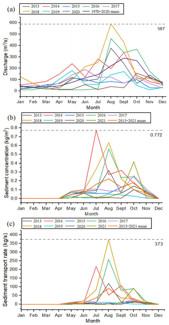 (a) Annual Discharge in the Lower Reaches of the Changhua River: The maximum value of 587 m3/s occurred in August 2018. (b) Annual Sediment Concentration in the Lower Reaches of the Changhua River: The maximum value of 0.772 kg/m3 was recorded in July 2014. (c) Annual Sediment Transport Rate in the Lower Reaches of the Changhua River: The maximum value of 373 kg/s was reached in August 2018.